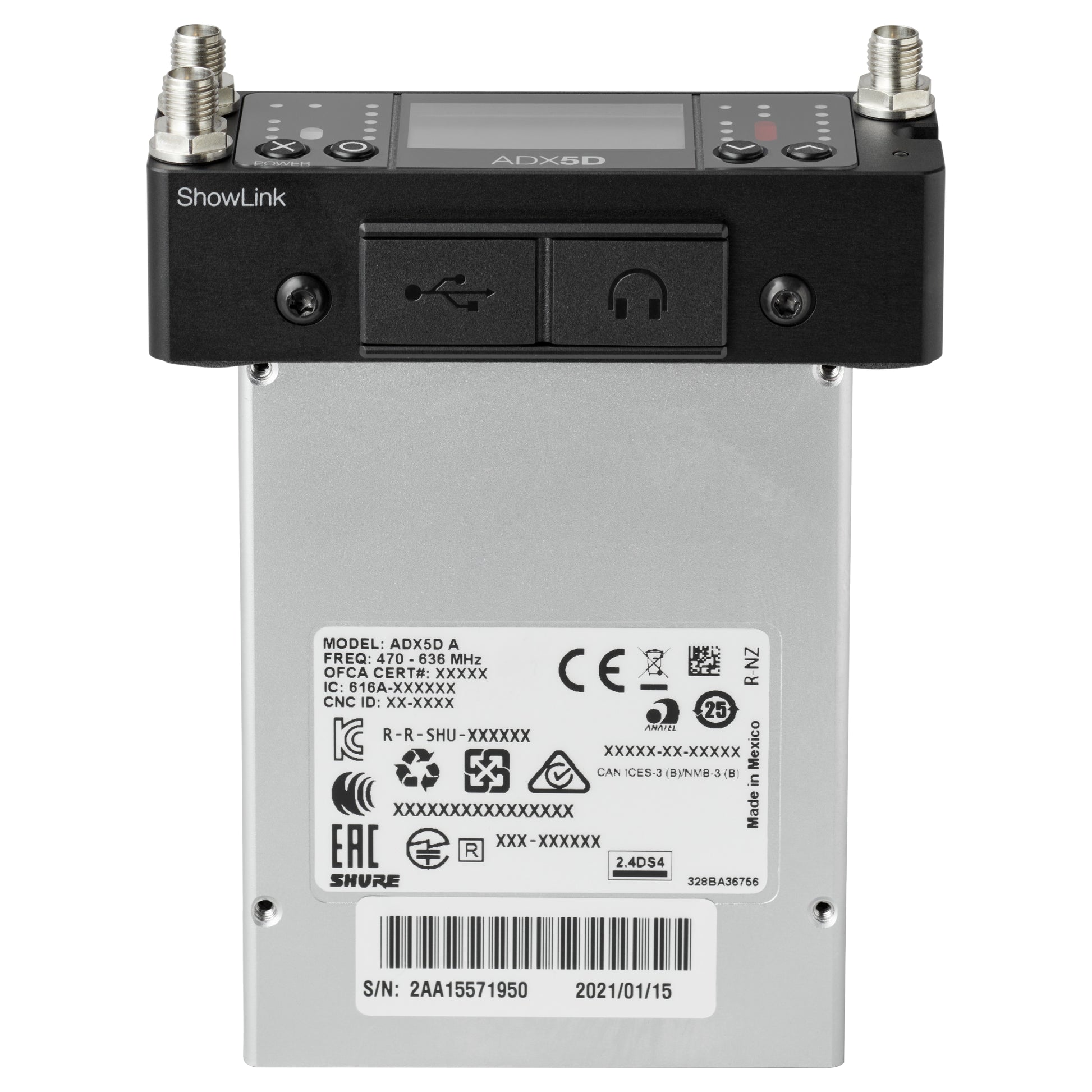 The ADX5D includes 2 removable antennas with standard SMA connectors, a Showlink (2.4GHz) antenna, and a USB-A to USB-C cable.