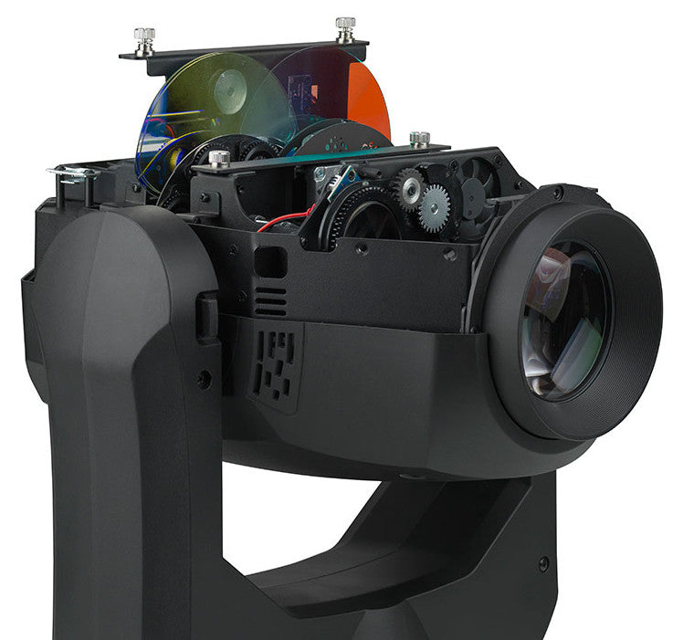 - Rotating gobo wheel: 7 gobos plus open, wheel rotation, gobo rotation, indexing and shake